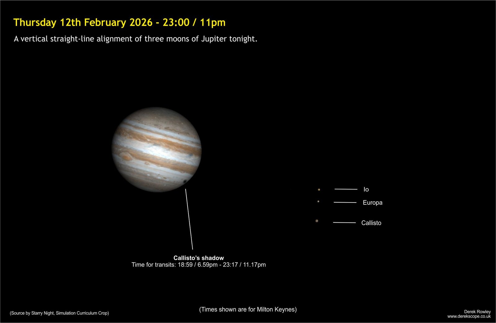 - A vertical straight‑line alignment occurs when three of the Galilean moons — usually Io, Europa, Ganymede, or Callisto — appear in a single straight line.