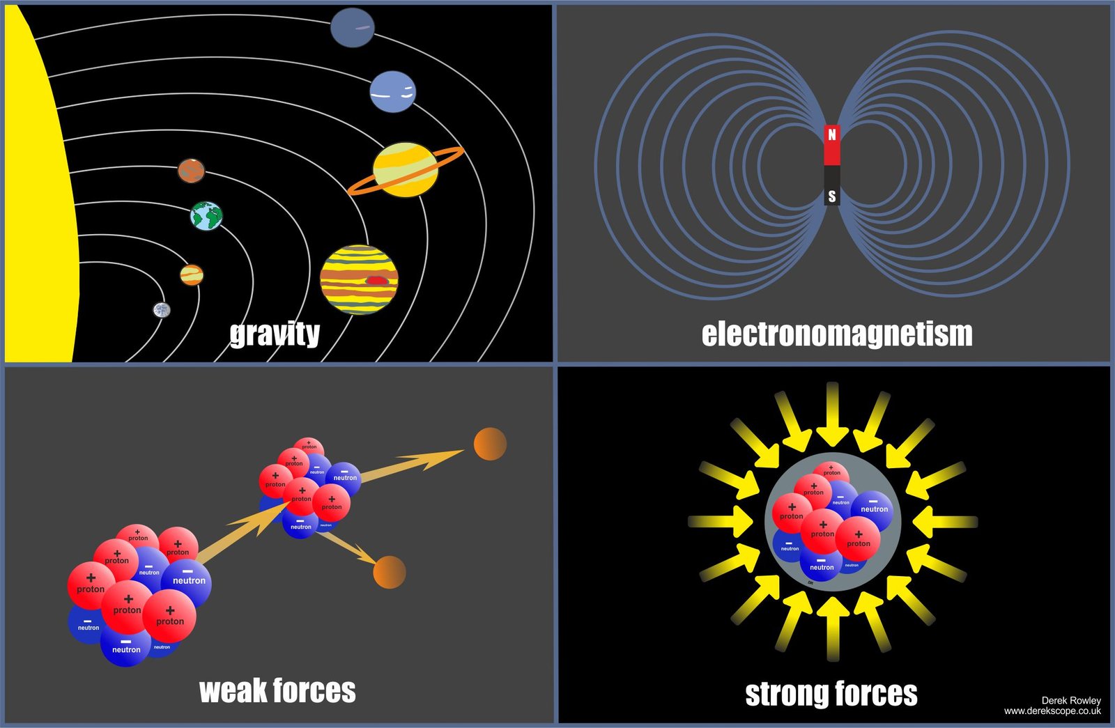 o - This illustration shows above the four fundamental forces of the universe (clockwise from top left):