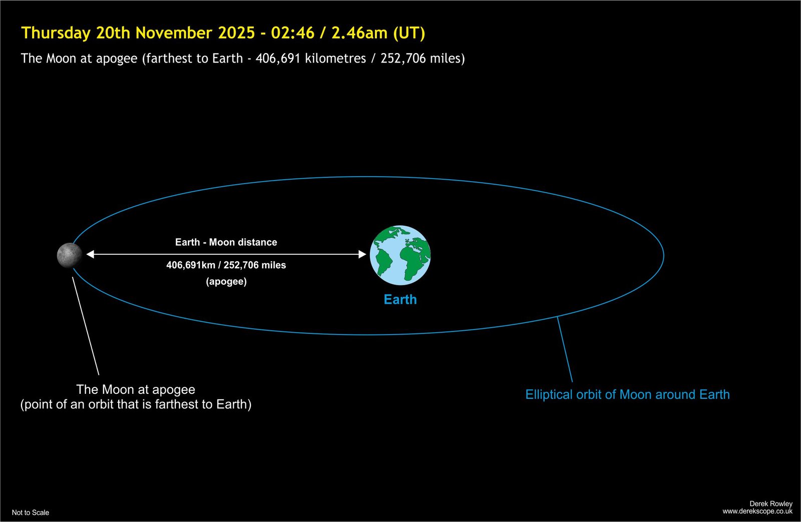 - The Moon reaches apogee at a distance of 252,706 miles from Earth at 02:46 /2.46am.